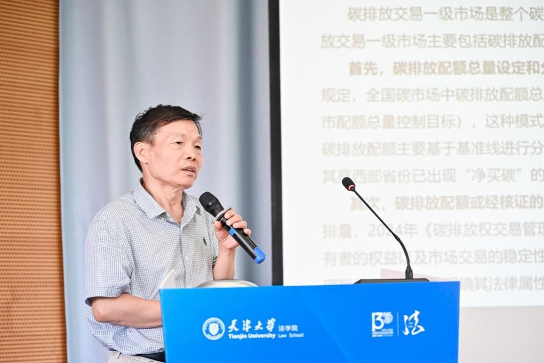 中国政法大学教授、《中国政法大学学报》主编曹明德作题为《中国碳排放交易面临的法律问题和立法建议》的主旨发言。他指出全国碳排放交易项目面临一级市场不健全、二级市场法律规制不足、调控和监管机制不足等问题,建议从完善政策体系、构建一级市场规则、提升二级市场规制力度、完善调控和监管机制、整合多种碳排放规制工具等方面进行规范升级。