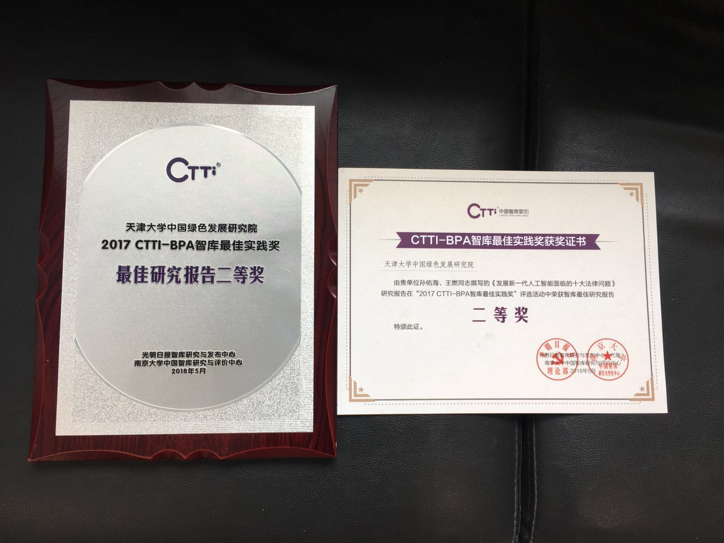 在本次研讨会上,由天津大学中国绿色发展研究院执行院长孙佑海、研究员王燃撰写的研究报告《发展新一代人工智能面临的十大法律问题》荣获“2017CTTI-BPA智库最佳实践奖最佳研究报告二等奖”。