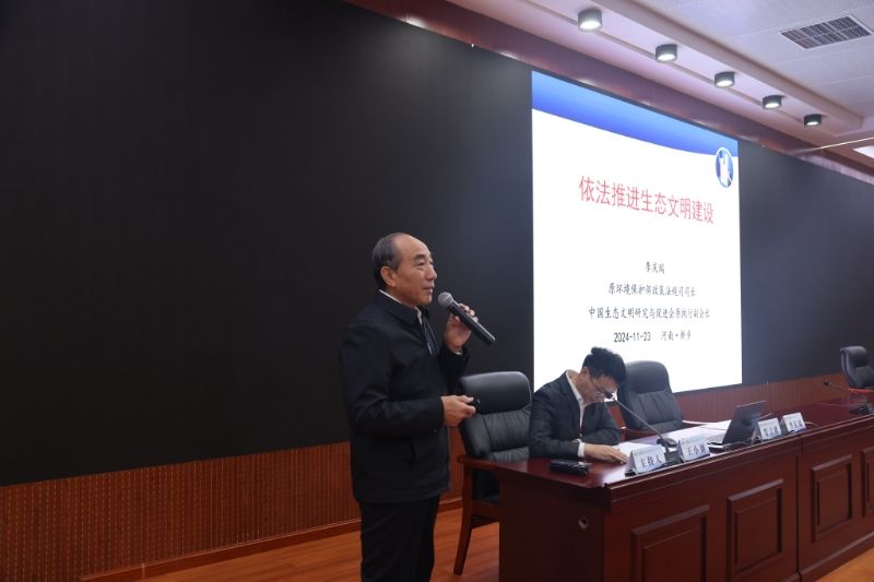 中国生态文明研究与促进会原执行副会长、原环境保护部政策法规司李庆瑞司长做题为《依法推进生态文明建设》的主旨报告。李司长指出,要坚持生态文明根本大计、目前对生态文明的认识高度、推进力度、实践深度前所未有。要加强生态文明法治建设,深入贯彻落实习近平生态文明思想,坚持用最严格制度最严密法治保护生态环境,推动生态环境标准全面优化升级,加快生态环境法典编撰。要深化生态文明体制改革,深刻认识深化体制改革重大意义,聚焦建设美丽中国,健全生态环境治理体系,健全绿色低碳发展机制,早日建成美丽中国。
